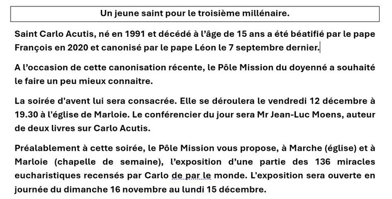 - 18h30 : Heyd, messe pour Léon PÉRILLEUX, Yvonne LECOQ, leurs fils Robert, Jean-Baptiste, Alice et Lucie LECOQ / Les déf. fam. MUYTJENS-GENERET, André MARÉCHAL et Irène STASSIN.
